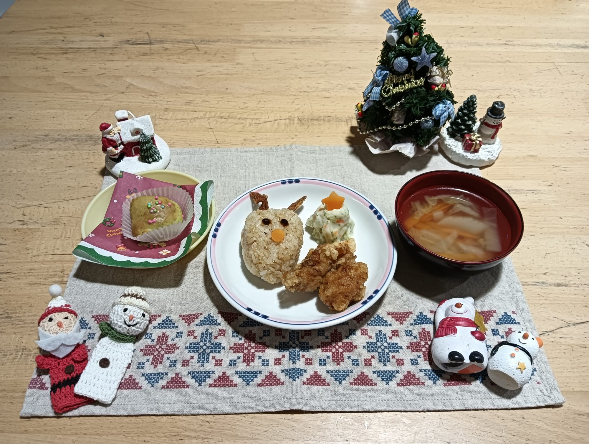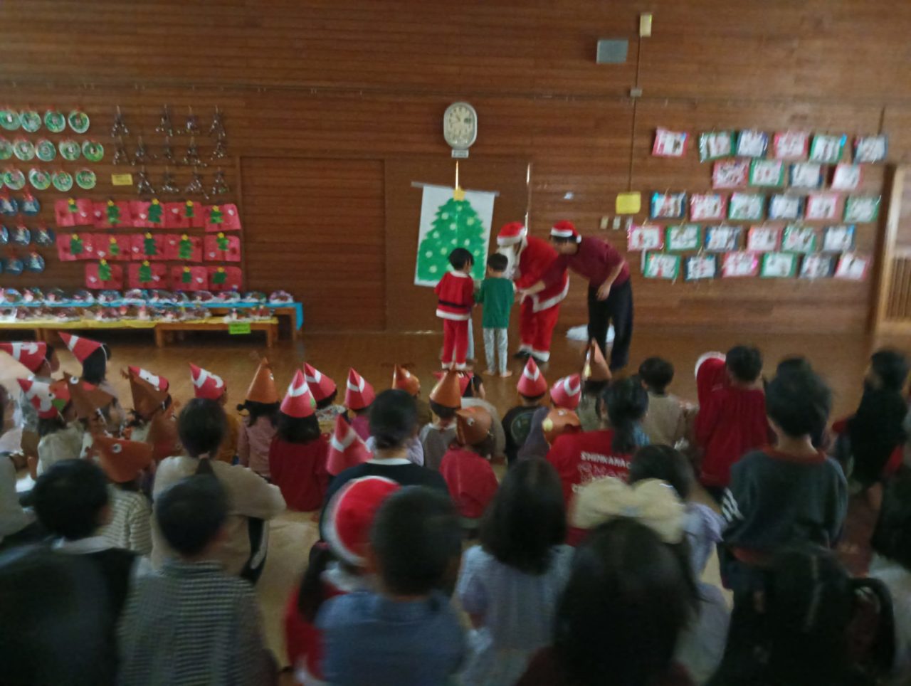 給食室だより おたのしみ会♡ 給食室だより 2025.12.24 今日は、待ちに待ったおたのしみ会です。ホールや各部屋にクリスマス製作を飾り、クリスマスソングをうたったり、クリスマスの手遊びをしたりして楽しみました。そして…リンリンリンと鈴の音が…少し暗くなったホールに真っ赤な衣装を着たサンタさんが登場!サンタさんへの質問タイムの後、それぞれのクラスにプレゼントをくれました。