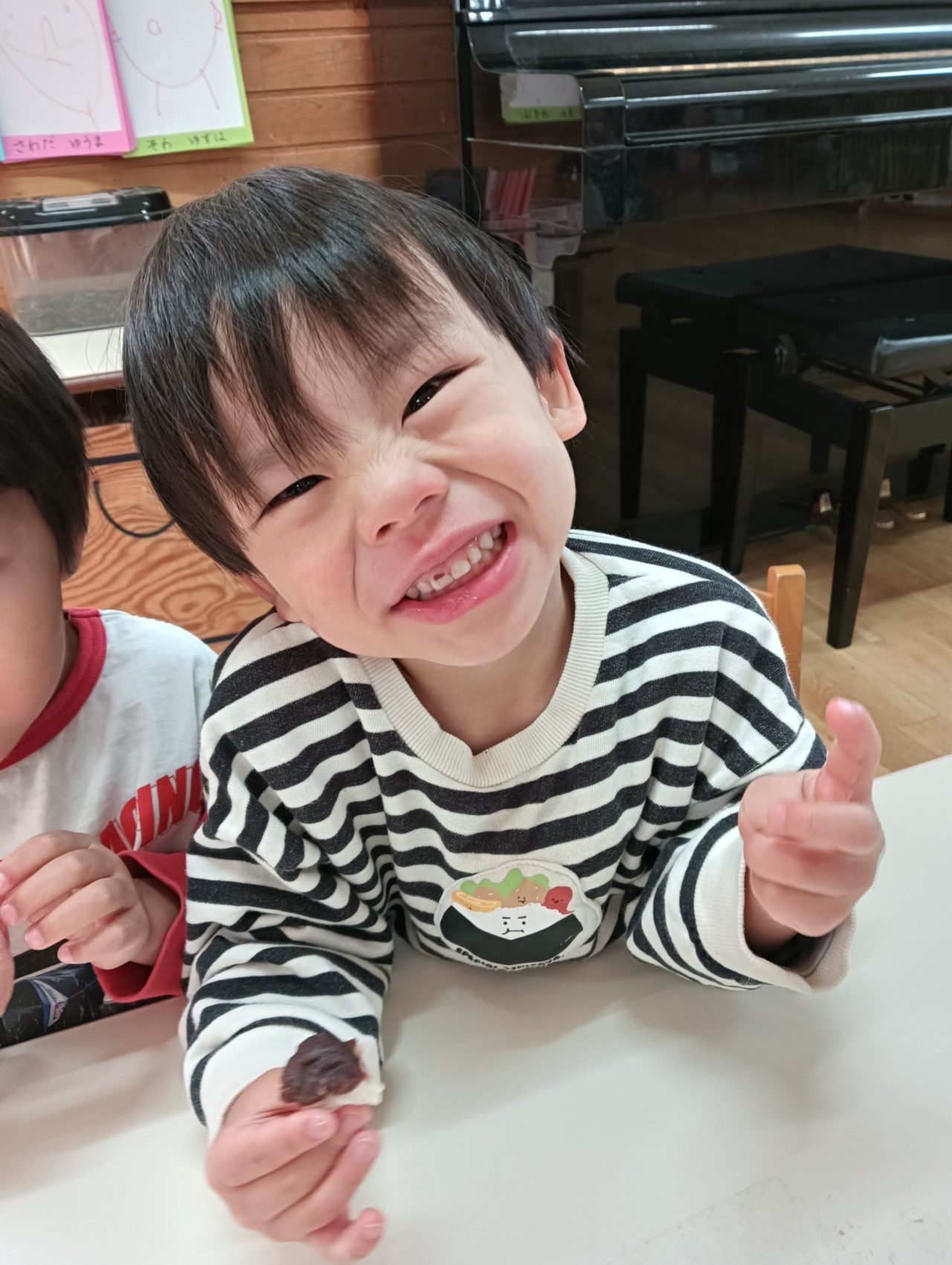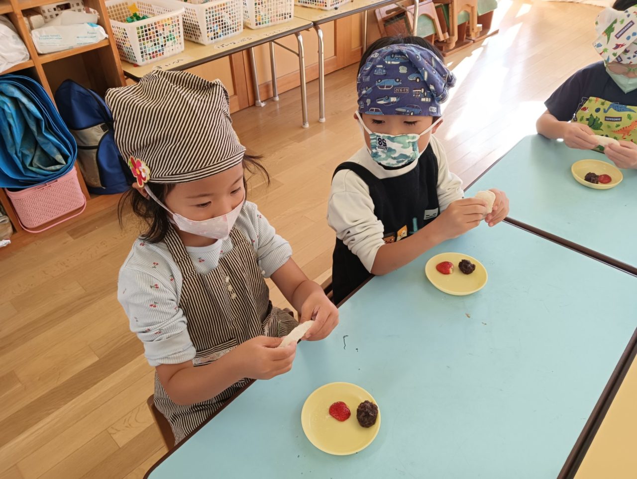 恒例の『ぞうぐみ、特別おもち』は、苺大福。自分でお餅にあんこと苺をくるんで(のせて)できあがり!