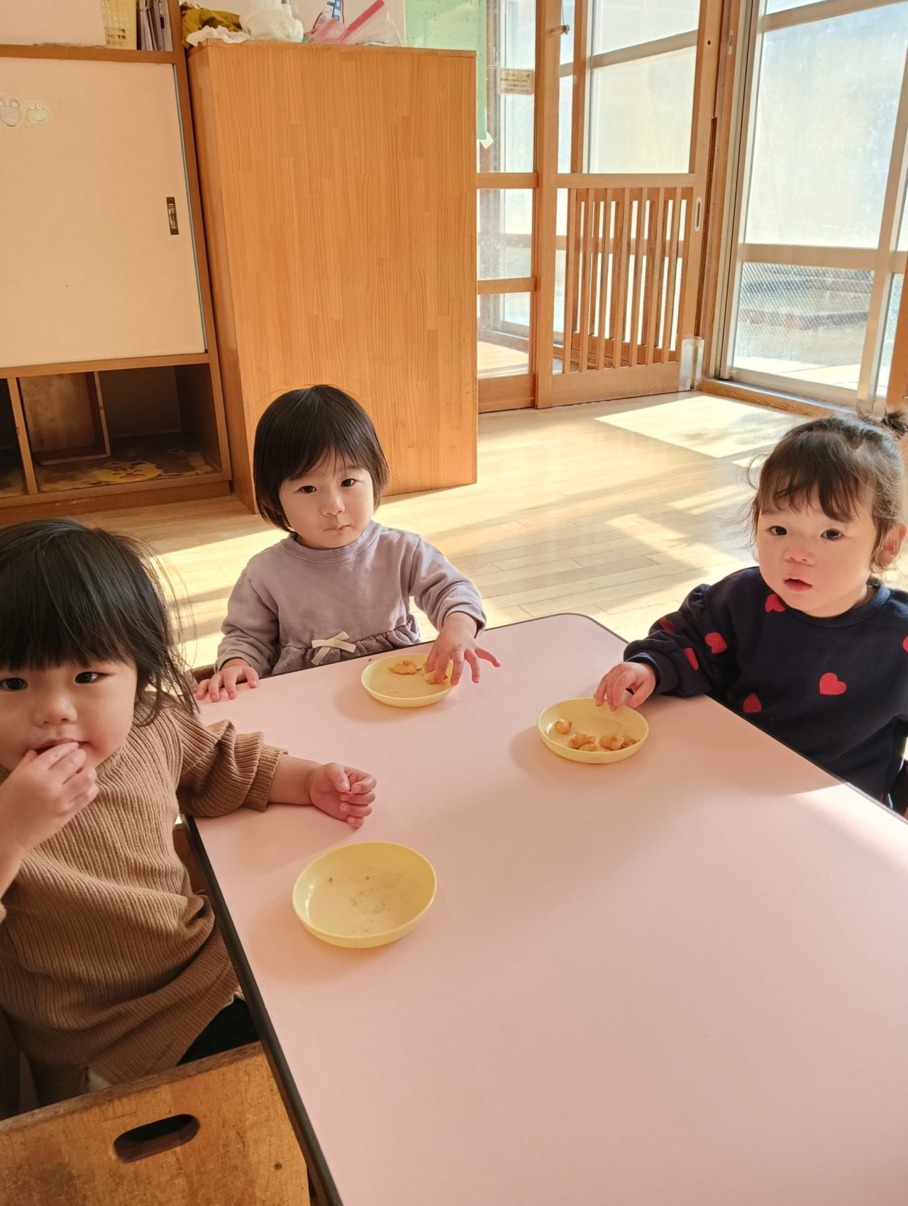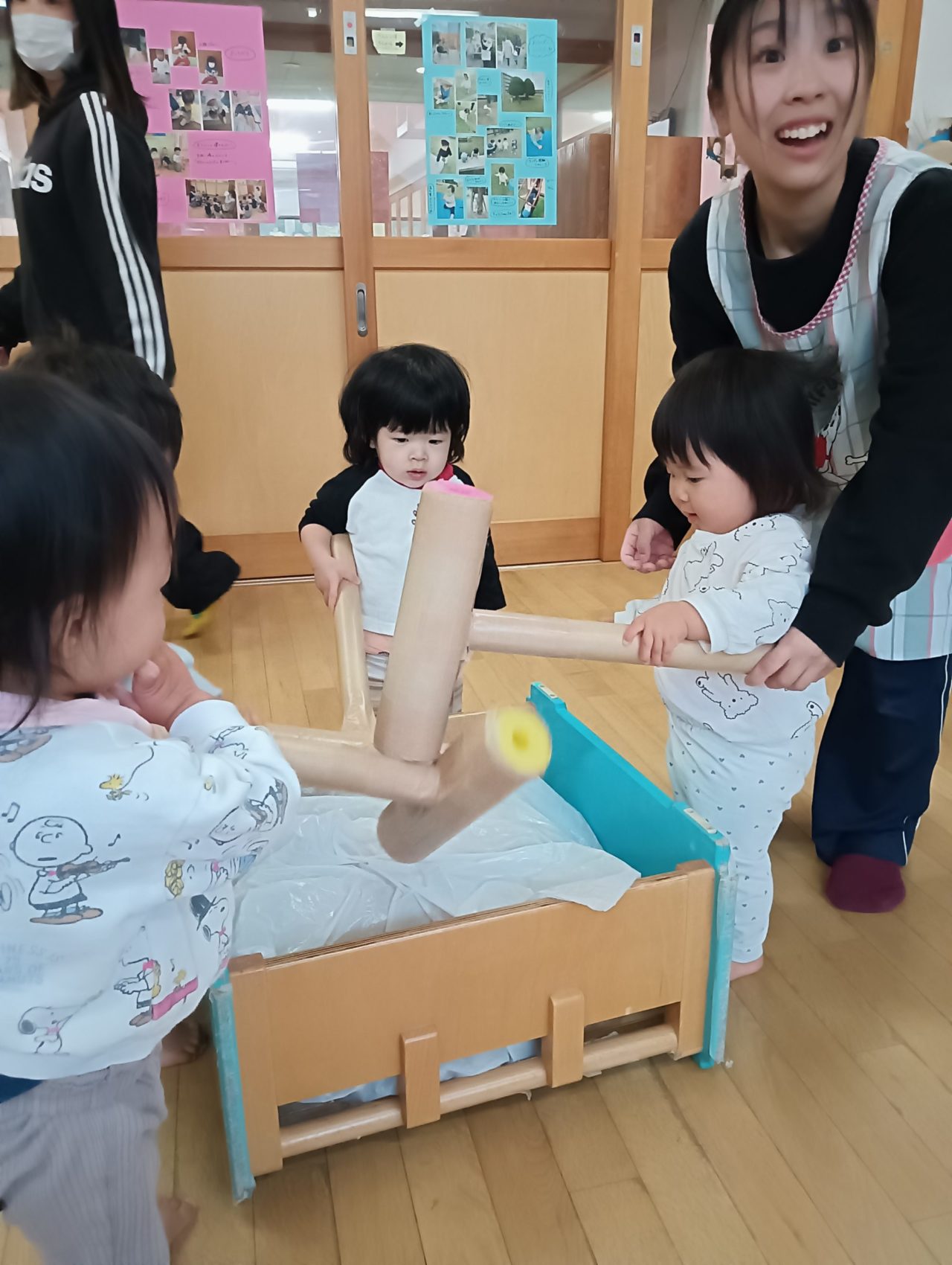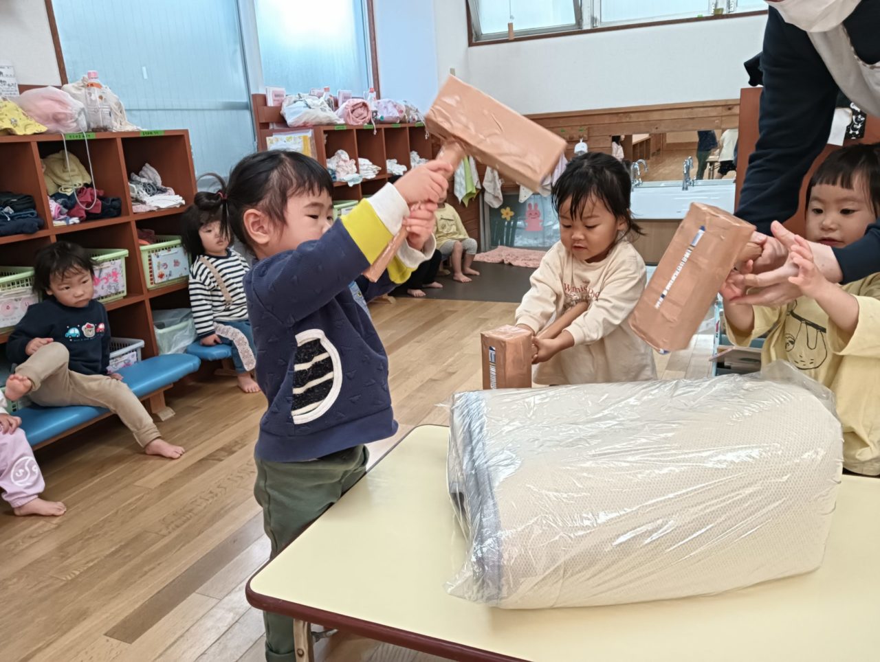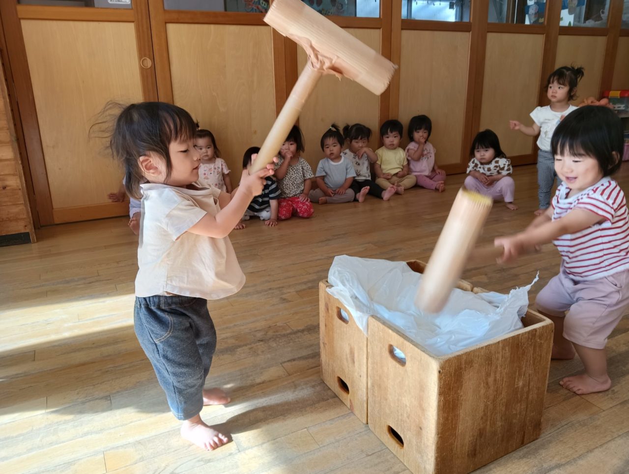 小さいクラスでは、お餅つきごっこをおこないました。