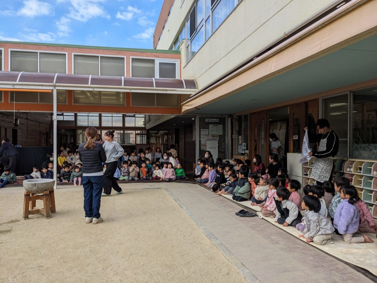 「きょうは、センターのおもちつき  ぺったんこ ぺったんこ ぺったんぺったん ぺったんこ」と餅つきの手遊びから始まりました!