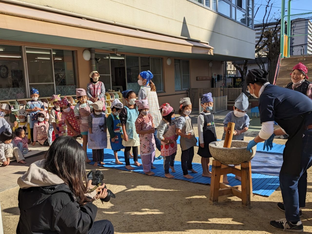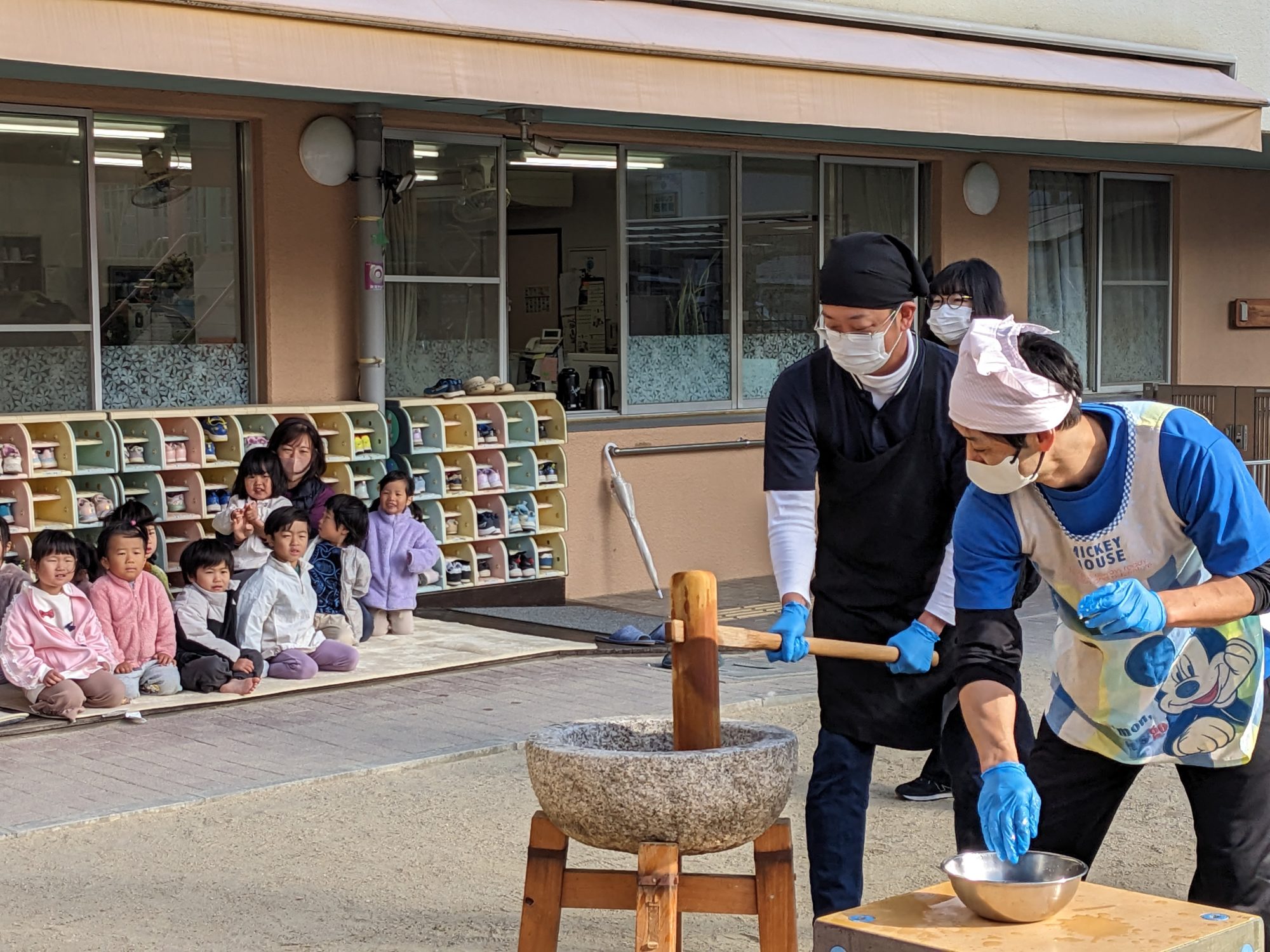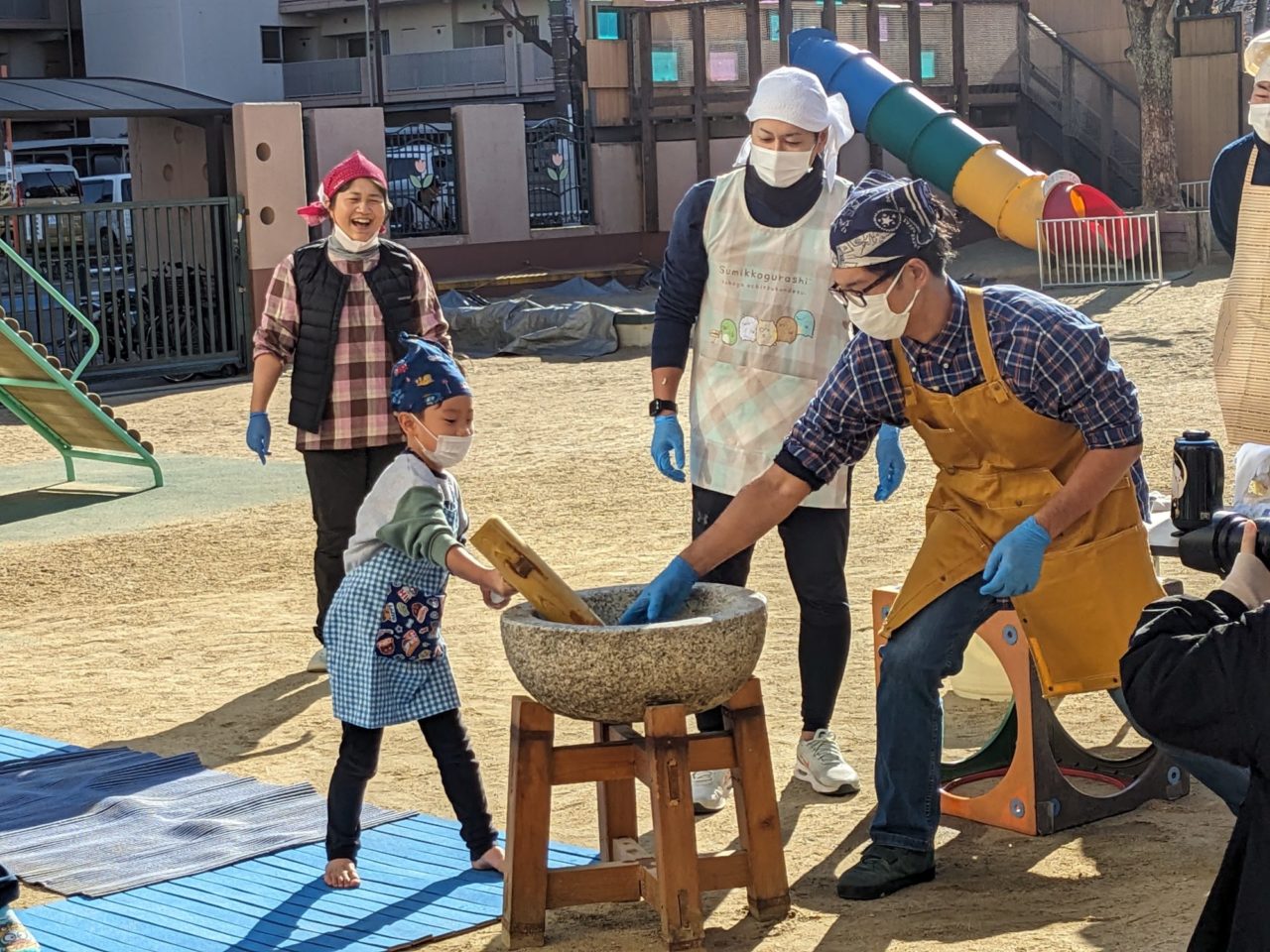 餅つきのつき手として、お父さん3人がお手伝いに来ていただけたので、子ども達も大喜び♡