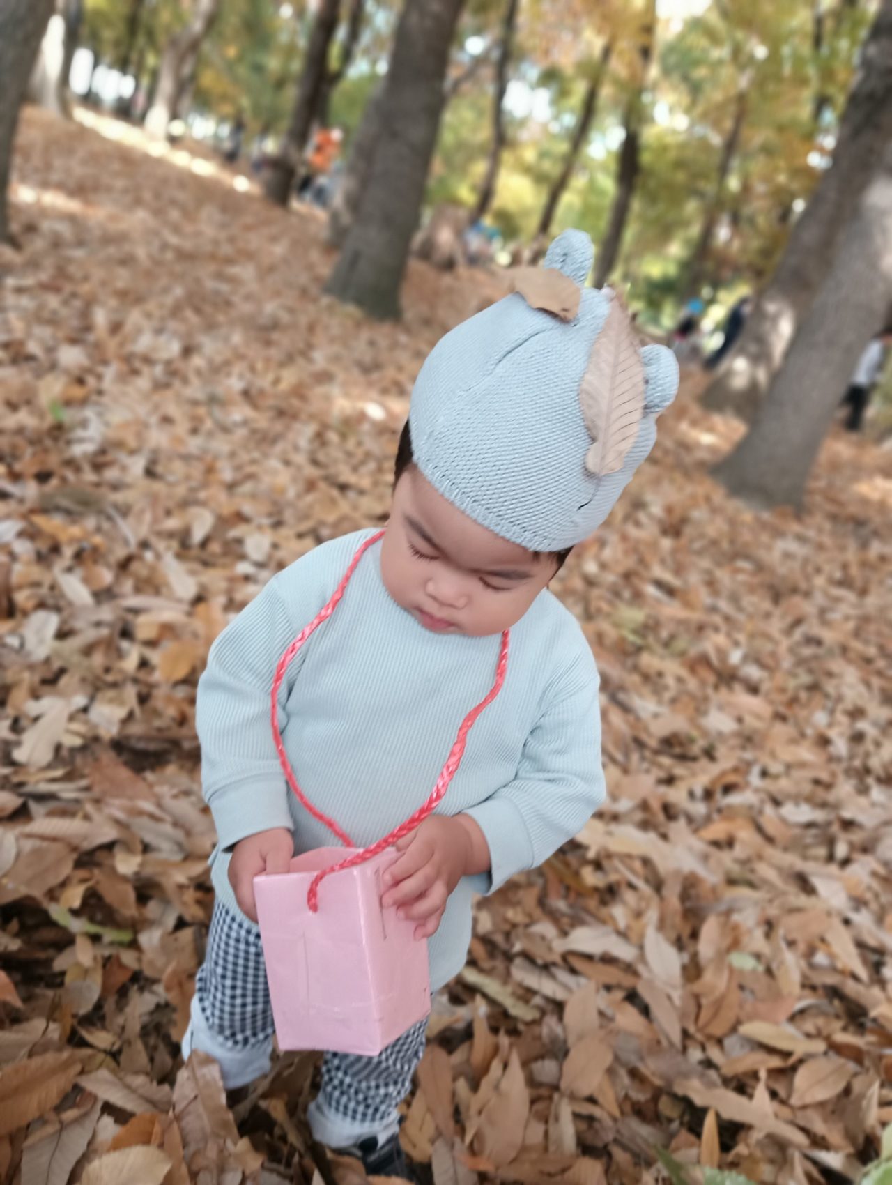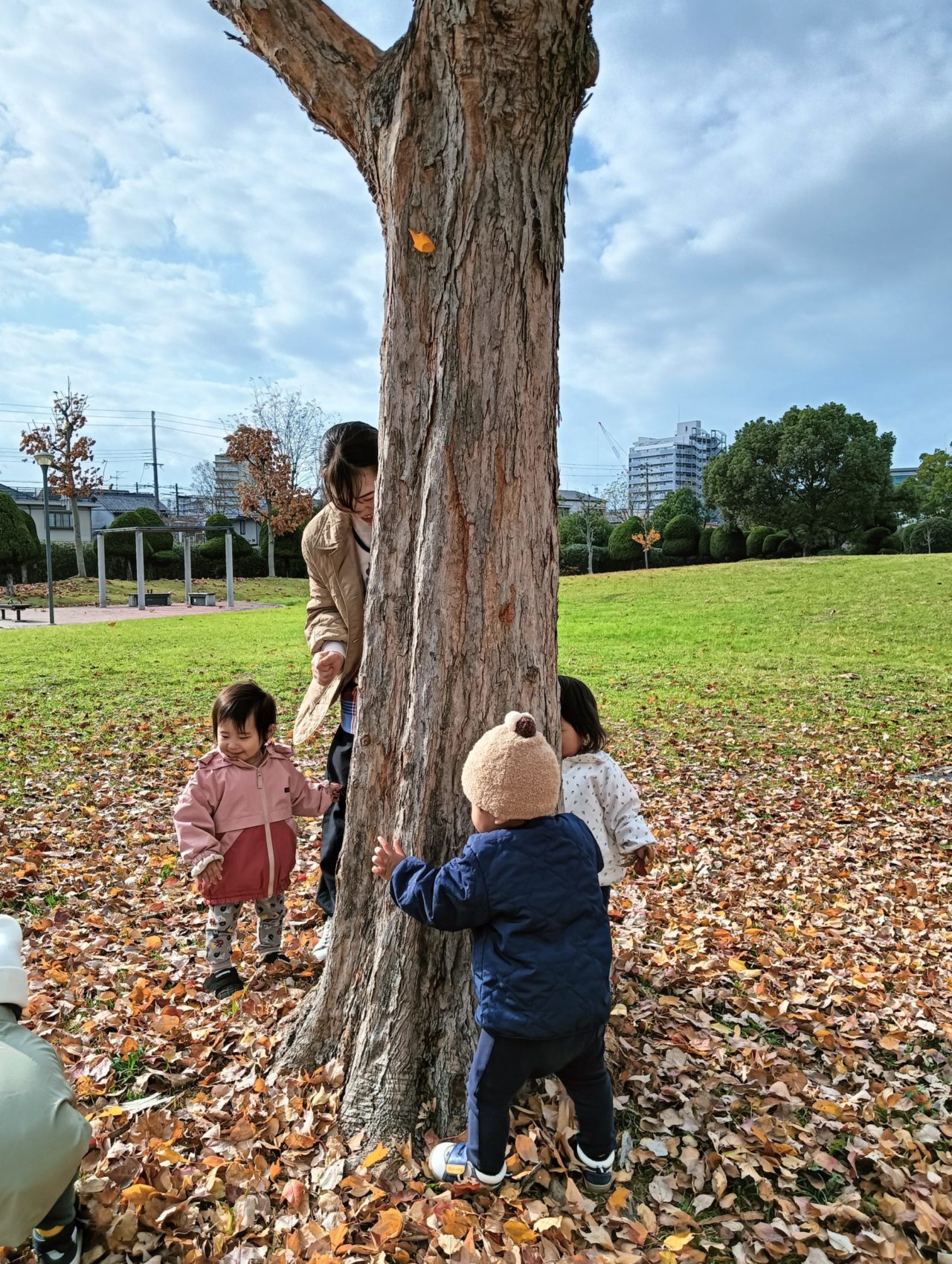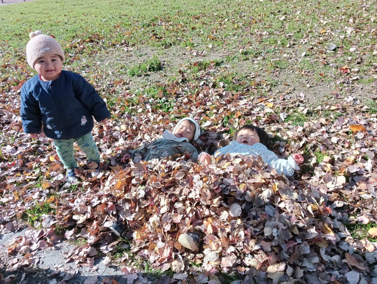 落ち葉の中をサクサク歩いたり、お布団にしてかけたり、みんなでお空に投げてヒラヒラを楽しんだり、大きな葉に隠れたり、穴をあけてオバケにしたり…