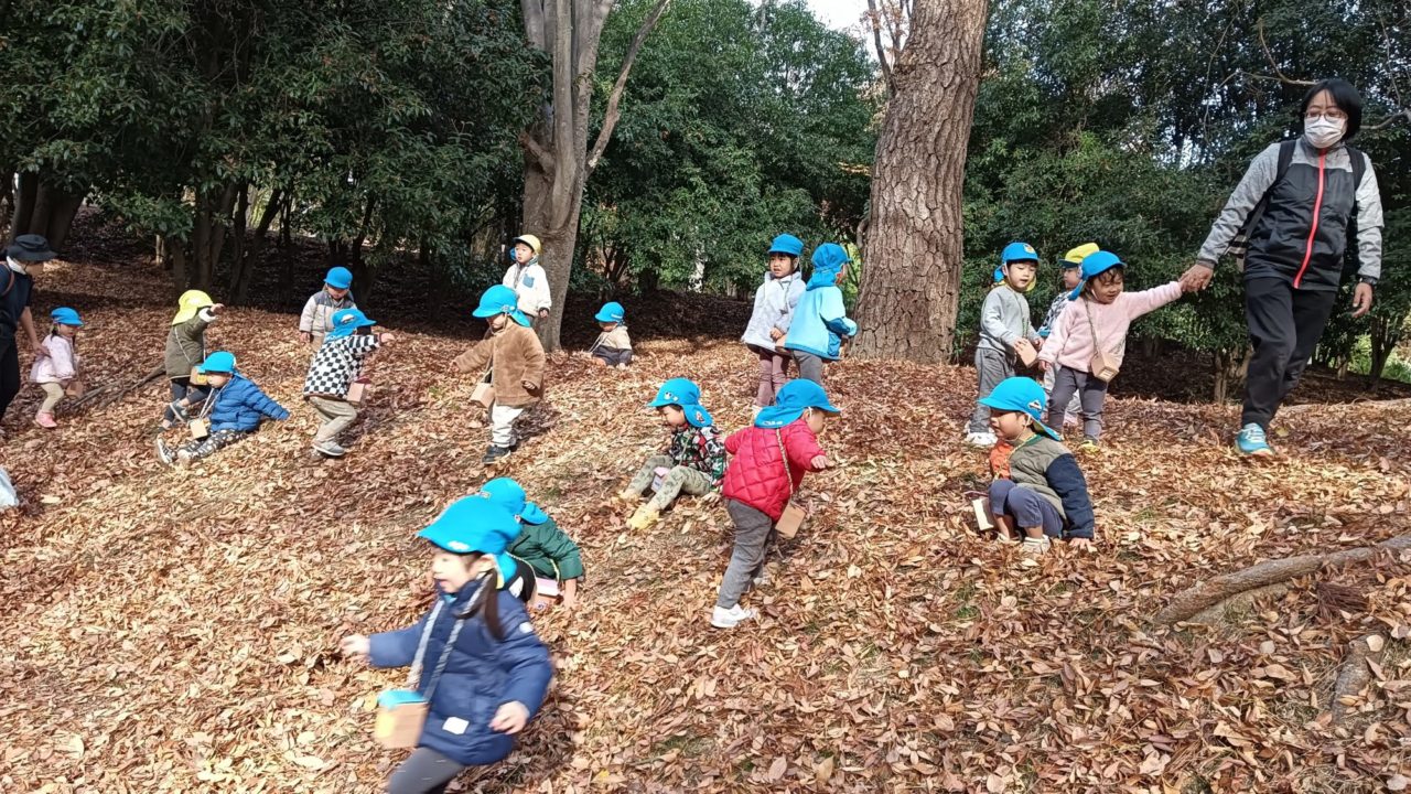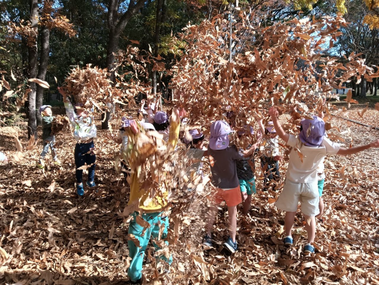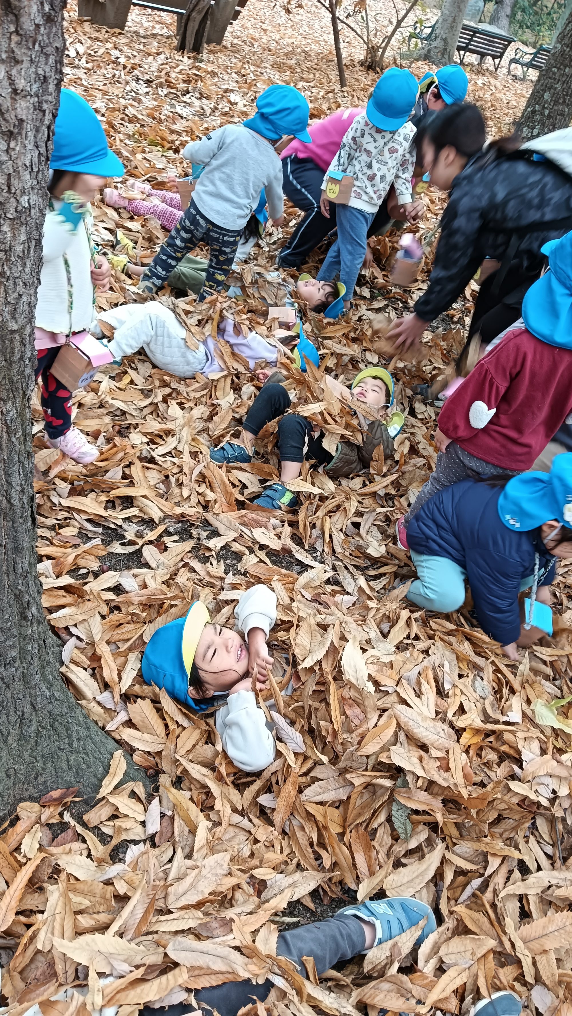 どこのクラスも 大泉緑地や近隣の公園のふかふかの落ち葉であそんでいます。