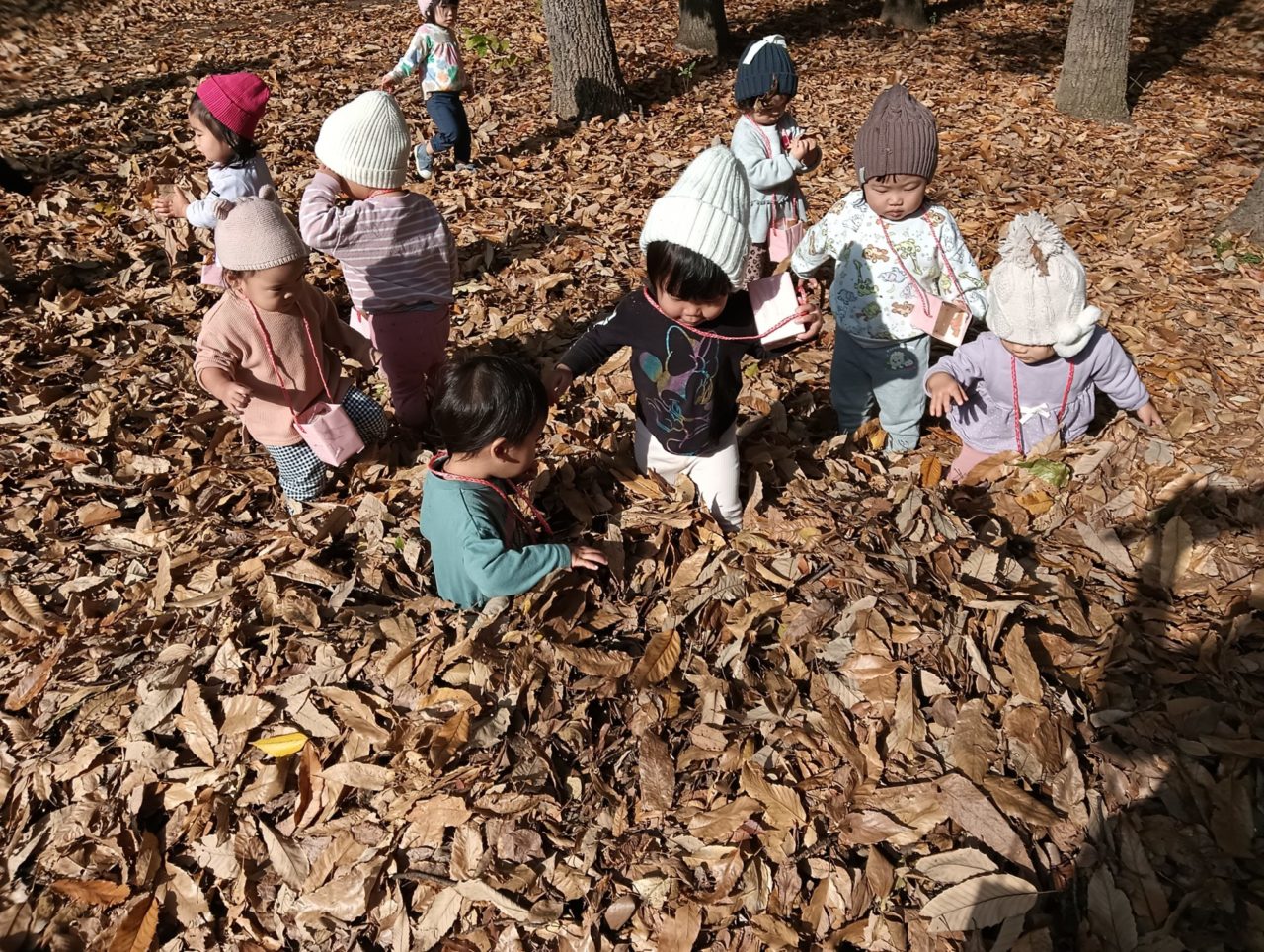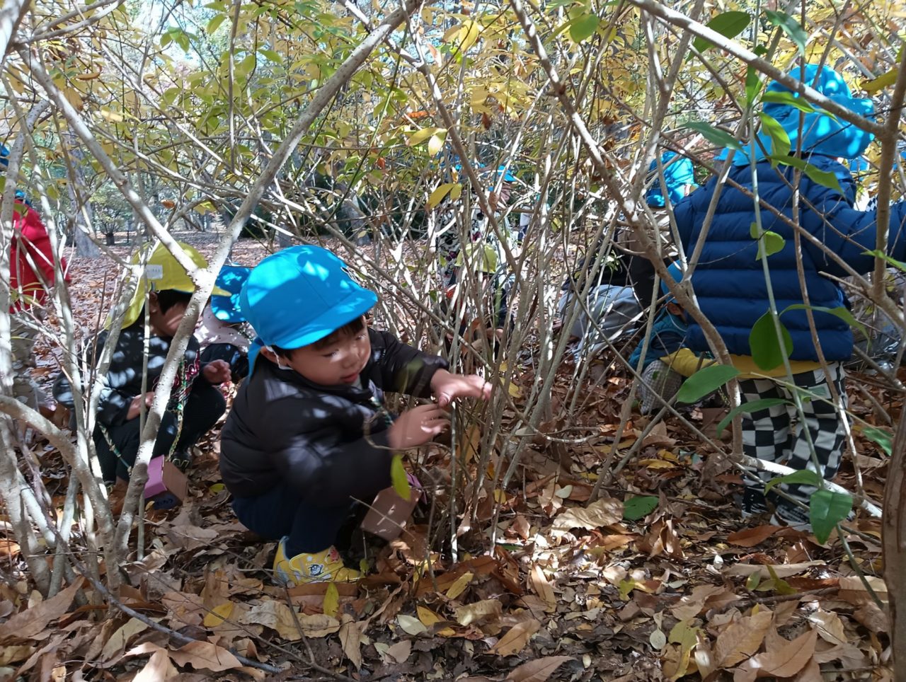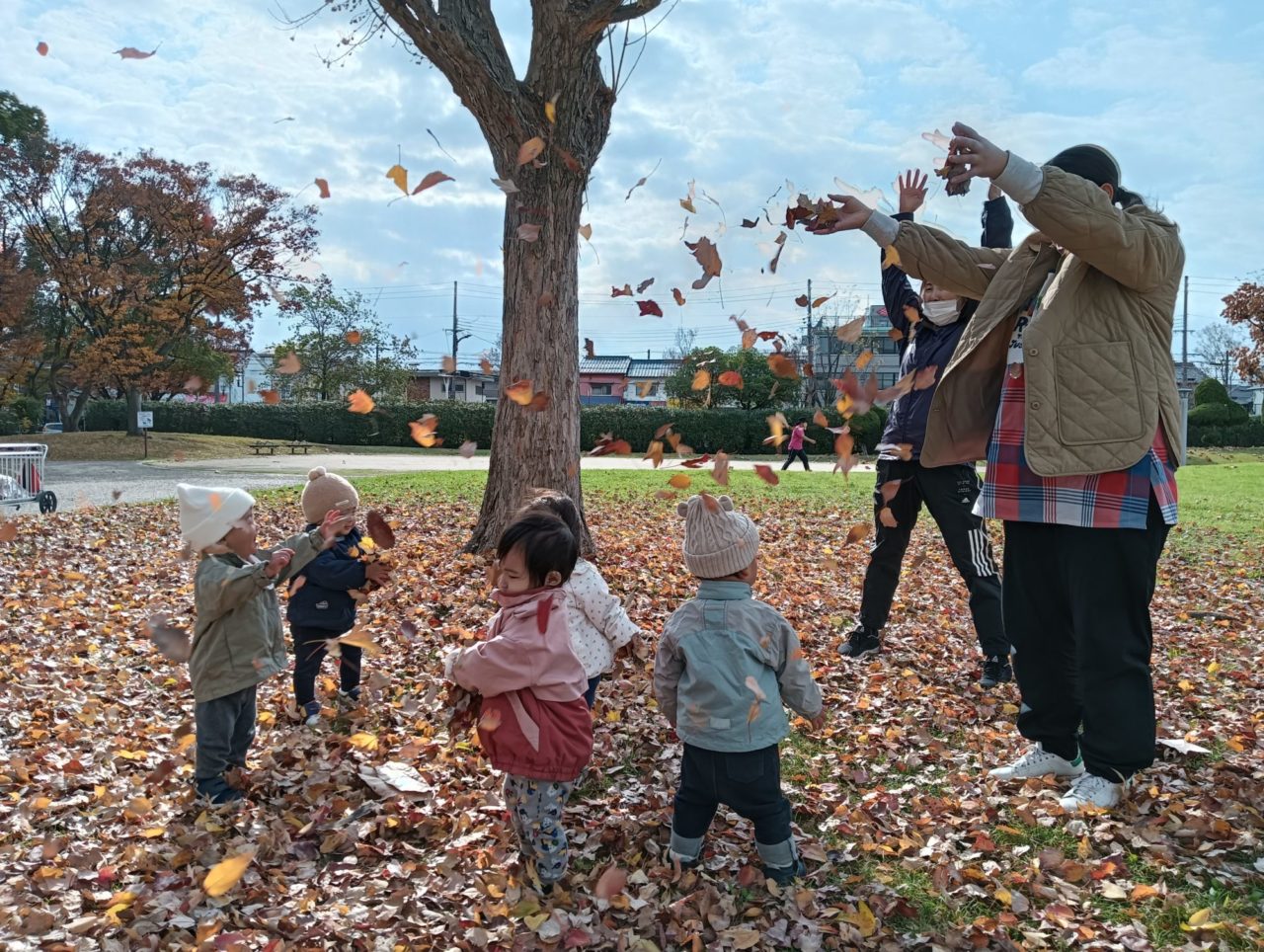 どこのクラスも 大泉緑地や近隣の公園のふかふかの落ち葉であそんでいます。
